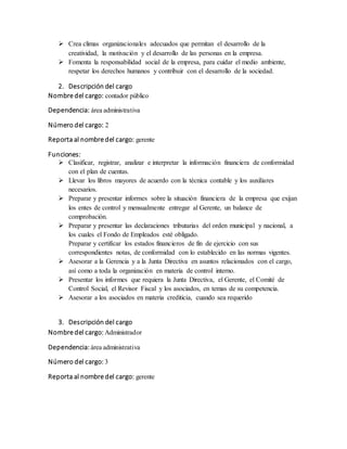 Este documento describe los cargos y funciones de seis posiciones clave dentro de una empresa: Gerente General, Contador Público, Administrador, Vendedor, Ingeniero de Sistemas y Publicista. Para cada cargo, se especifica su dependencia, número, a quién reporta y las principales funciones y responsabilidades.