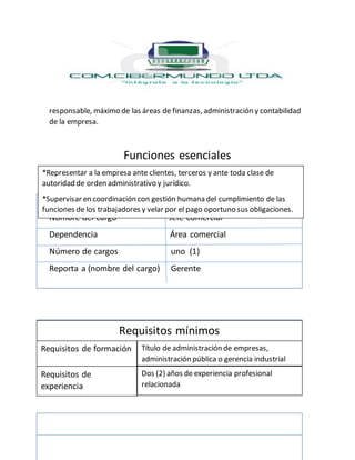 Este documento describe los cargos y funciones de una empresa. Incluye cargos como Gerente, Jefe Comercial, Asesor de Ventas, Vendedor, Jefe Administrativo, Mensajero, Servicios Generales, Jefe Financiero, y Contador. Cada cargo tiene responsabilidades específicas y requisitos mínimos de educación y experiencia. El objetivo general es administrar y hacer funcionar efectivamente a la empresa a través de la gestión de personal y funciones en áreas como comercial, operativa, administrativa y financiera.