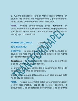 Este documento presenta el manual de funciones de la empresa Transformapel S.A., describiendo los diferentes cargos y departamentos de la organización, sus objetivos, funciones y perfiles requeridos. Se definen roles como Presidente, Gerente, Departamentos de Contabilidad, Presupuesto, Recursos Humanos, Ventas y Publicidad, especificando a quién reporta cada cargo y las tareas y responsabilidades correspondientes. El manual busca establecer de manera clara las condiciones necesarias para un funcionamiento eficiente de la compañía.