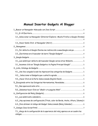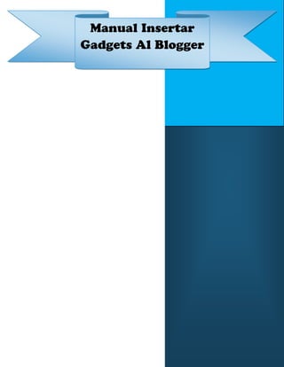 Este manual explica cómo insertar gadgets en Blogger. Primero, se busca un navegador y se ingresa a Google Gadgets para seleccionar un gadget como un reloj. Luego, se copia el código HTML/JavaScript del gadget y se ingresa a Blogger, donde se añade el código al diseño para mostrar el gadget en el blog.