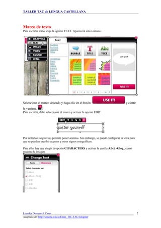 Este documento proporciona instrucciones detalladas sobre cómo crear un glog (póster digital) en la plataforma Glogster. Explica cómo registrarse en Glogster, agregar un fondo, agregar marcos de texto e imágenes, y guardar y compartir el glog terminado.