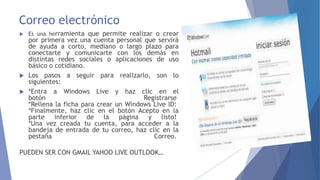 Este documento describe brevemente varias herramientas técnicas como correo electrónico, Facebook, Audacity, Spreaker, Pinterest y SlideShare. Explica los pasos básicos para crear una cuenta en cada plataforma y las funciones principales como comunicarse, grabar audio, transmitir podcasts, compartir imágenes e incluir presentaciones.