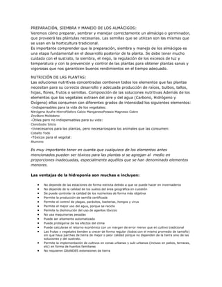 La hidroponía es una técnica de cultivo que permite cultivar plantas sin suelo, utilizando soluciones nutritivas y sustratos que sostienen las raíces. Esta práctica se adapta a espacios reducidos en entornos urbanos y no depende de la calidad del suelo, lo que facilita la producción de hortalizas frescas de manera eficiente. Los aspectos cruciales para el éxito en la hidroponía incluyen la elección adecuada del sustrato, el manejo de las plántulas y la correcta formulación de soluciones nutritivas.