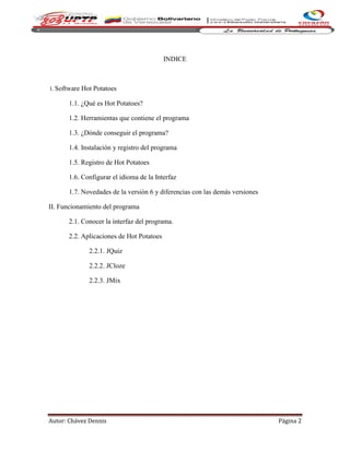Este documento proporciona información sobre el software Hot Potatoes. Explica que Hot Potatoes es un conjunto de herramientas que permiten crear ejercicios interactivos para la web sin necesidad de conocimientos de programación. Describe las seis herramientas incluidas y sus funciones, el proceso de instalación y registro, y las mejoras introducidas en la versión 6 como soporte para más idiomas y tipos de preguntas híbridas.