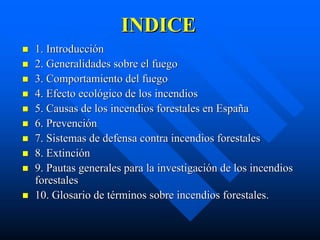 Este documento describe los incendios forestales, incluyendo su comportamiento, causas comunes en España, métodos de prevención como la silvicultura preventiva y quemas controladas, sistemas de defensa, técnicas de extinción, e investigación de incendios. Se centra en explicar los conceptos clave relacionados con los incendios forestales.