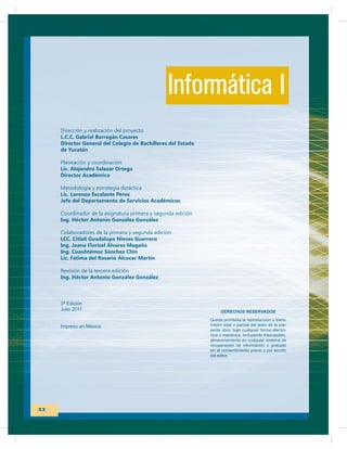 Este documento presenta la guía didáctica para la asignatura de Informática I. Explica los objetivos y la estrategia didáctica utilizada, la cual consta de siete pasos. Luego, describe el contenido organizado en cuatro bloques principales: 1) Funciones básicas del sistema operativo y seguridad de la información, 2) Uso de recursos de red, 3) Elaboración de documentos, y 4) Presentaciones electrónicas. Cada bloque contiene varias sesiones con información sobre conceptos, herramientas y procedim