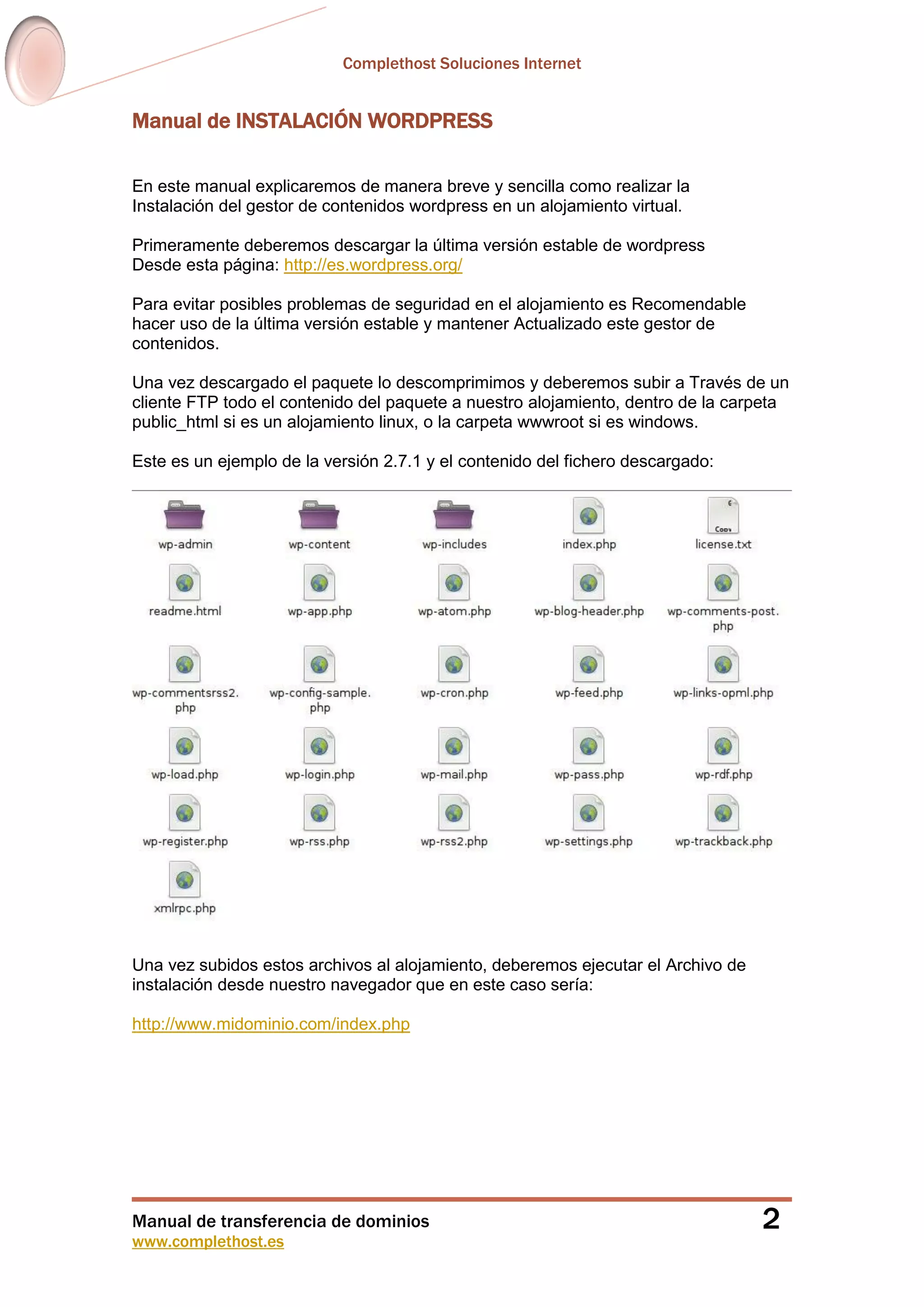 Este documento proporciona instrucciones para instalar WordPress en un alojamiento web. Explica cómo descargar e instalar WordPress, crear una base de datos, completar la configuración inicial y agregar plugins de seguridad recomendados como WP Antivirus y Akismet. También cubre cómo instalar plugins adicionales a través del panel de administración de WordPress.