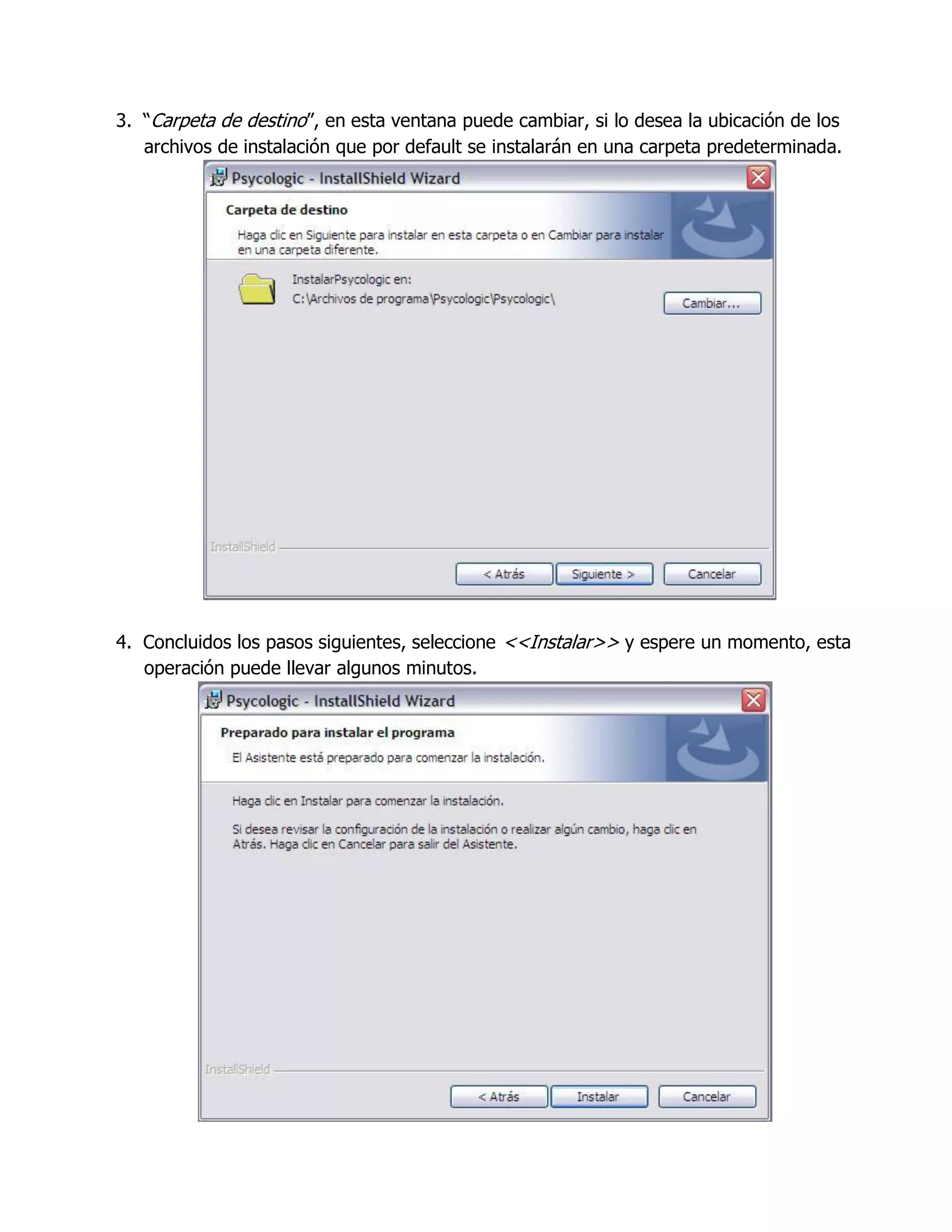 El documento proporciona instrucciones para instalar y ejecutar por primera vez el sistema Psycologic. Incluye 7 pasos para instalar el software mediante el archivo Setup.exe y reconocer la llave de licencia con HASPUserSetup.exe. Luego, para ejecutar el sistema por primera vez, se deben personalizar los reportes ingresando el nombre de la compañía, administrar usuarios y contraseñas, e ingresar la clave de acceso.