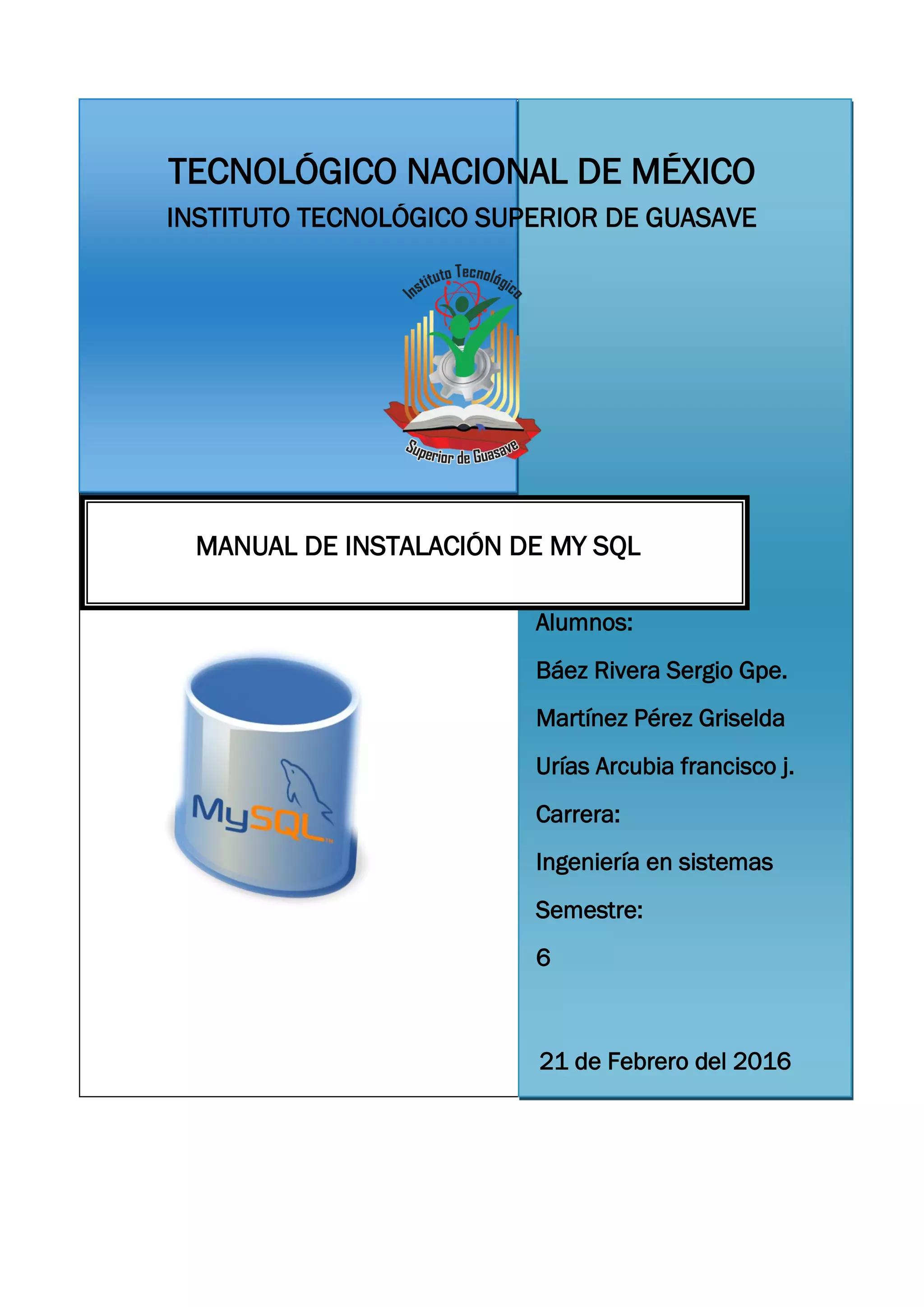 Este documento proporciona instrucciones para instalar MySQL. Primero enumera los requisitos técnicos mínimos como 512 MB de RAM, 1 GB de espacio en disco y soporte para sistemas operativos Windows, Linux y Unix. Luego indica que los usuarios deben descargar la última versión de MySQL desde su sitio web y ejecutar el instalador, siguiendo los pasos en las ventanas sucesivas para completar la instalación. Una vez finalizada, los usuarios podrán acceder a la interfaz principal de MySQL.