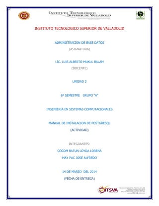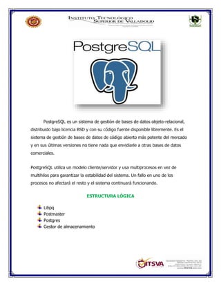 El documento proporciona instrucciones para instalar PostgreSQL en Windows 7. Explica que PostgreSQL es un sistema de gestión de bases de datos de código abierto y que utiliza un modelo cliente/servidor. Detalla los pasos para descargar e instalar PostgreSQL, incluyendo la creación de carpetas, la introducción de contraseñas y la configuración del puerto. Una vez finalizada la instalación, se habrá creado un servicio para iniciar PostgreSQL de forma automática.