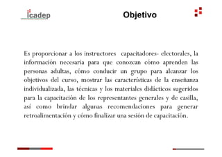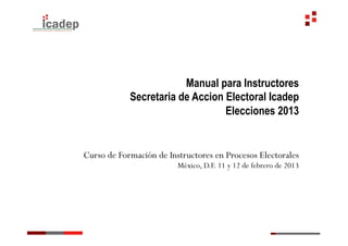 Este documento proporciona información para instructores electorales sobre cómo capacitar a representantes generales y de casilla para las elecciones de 2013 en México. Explica que el objetivo es enseñarles sobre el aprendizaje en adultos, cómo conducir un grupo, técnicas de enseñanza individualizada y recomendaciones para la retroalimentación y conclusión de las sesiones de capacitación. También describe el perfil de un instructor, el proceso de enseñanza-aprendizaje, y la logística para impartir los cursos.