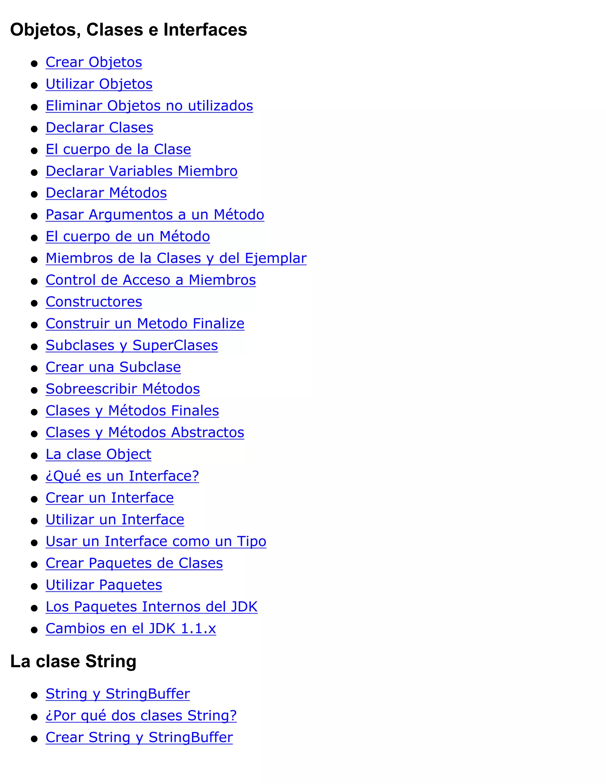 Este documento presenta un índice para un tutorial básico de Java. Cubre temas como la primera introducción a Java, conceptos de programación orientada a objetos, características del lenguaje Java, clases y objetos, manejo de errores con excepciones, hilos, entrada y salida, applets, interfaz gráfica de usuario, gráficos 2D, red y beans. El índice incluye subtemas para cada sección principal con enlaces a páginas que proporcionan más detalles sobre cada tema.