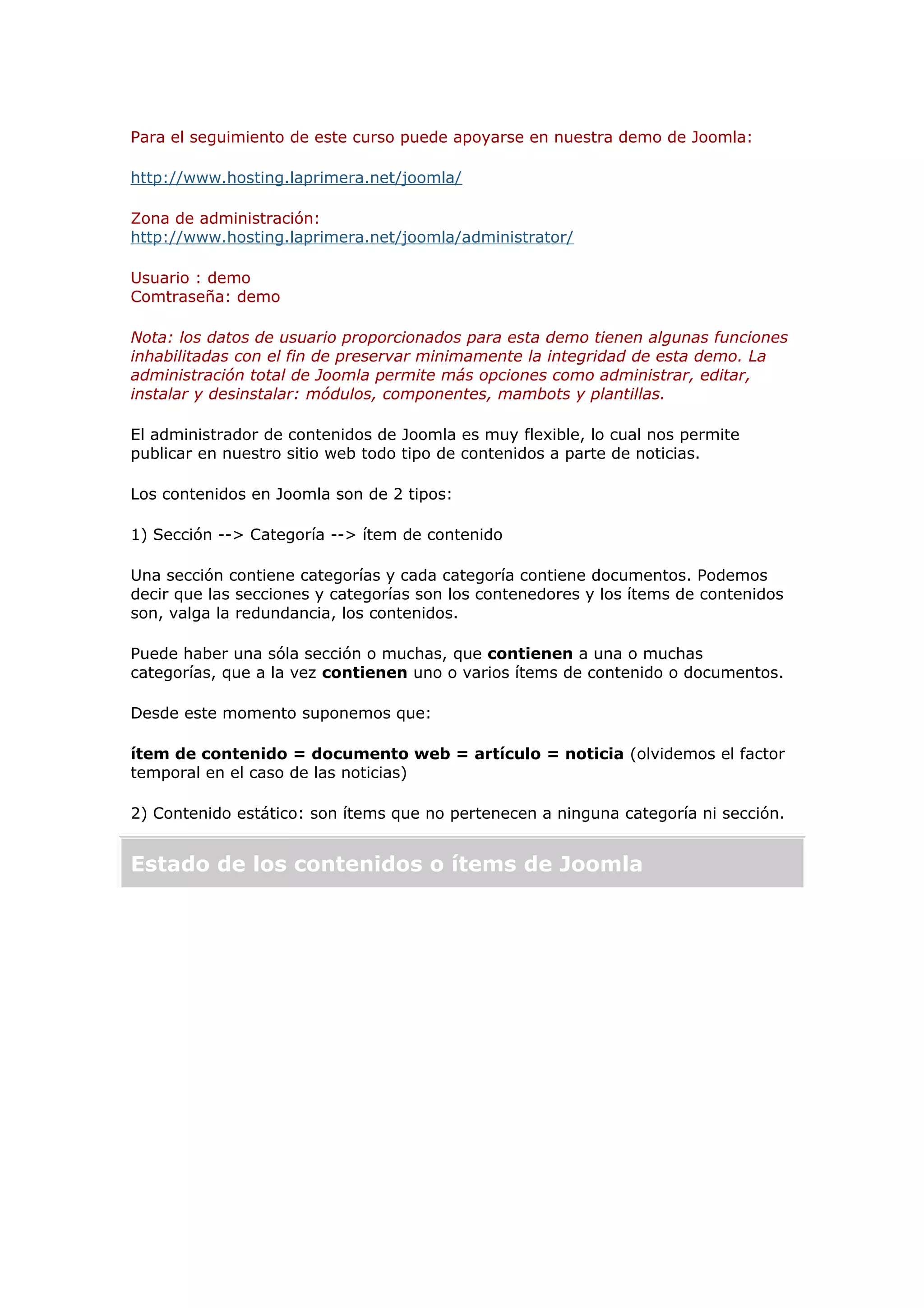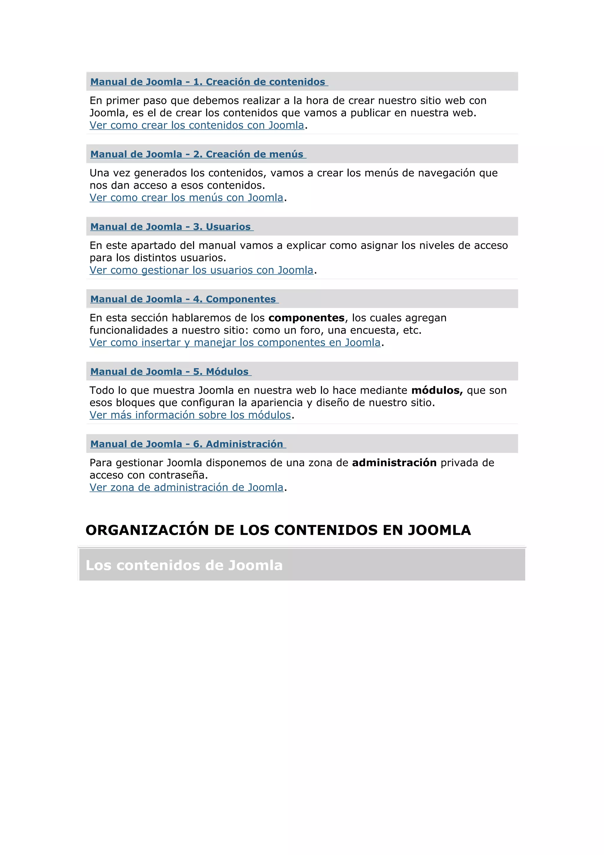 El documento describe los pasos para crear contenido y menús de navegación en Joomla. Explica cómo crear secciones, categorías e ítems de contenido, y luego crear menús que enlacen a este contenido. También cubre los tipos de usuarios y niveles de acceso en Joomla.