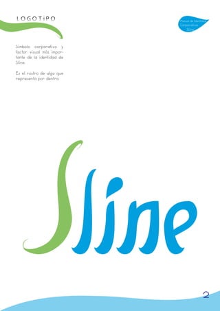 El documento es un manual de identidad corporativa para la marca Sline, detallando las características del logotipo, su construcción visual, y las aplicaciones en diferentes formatos de papelería. Se enfatiza la importancia de mantener la integridad del logotipo en diversas aplicaciones, asegurando la correcta representación de la marca en fondos variados. Además, se especifican los colores y dimensiones adecuadas, así como recomendaciones para la utilización de la marca en invitaciones y otras herramientas de comunicación corporativa.
