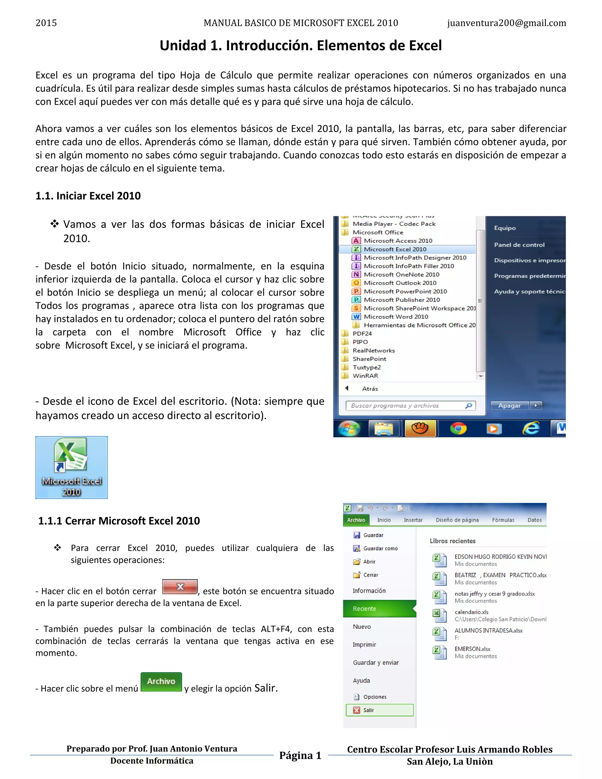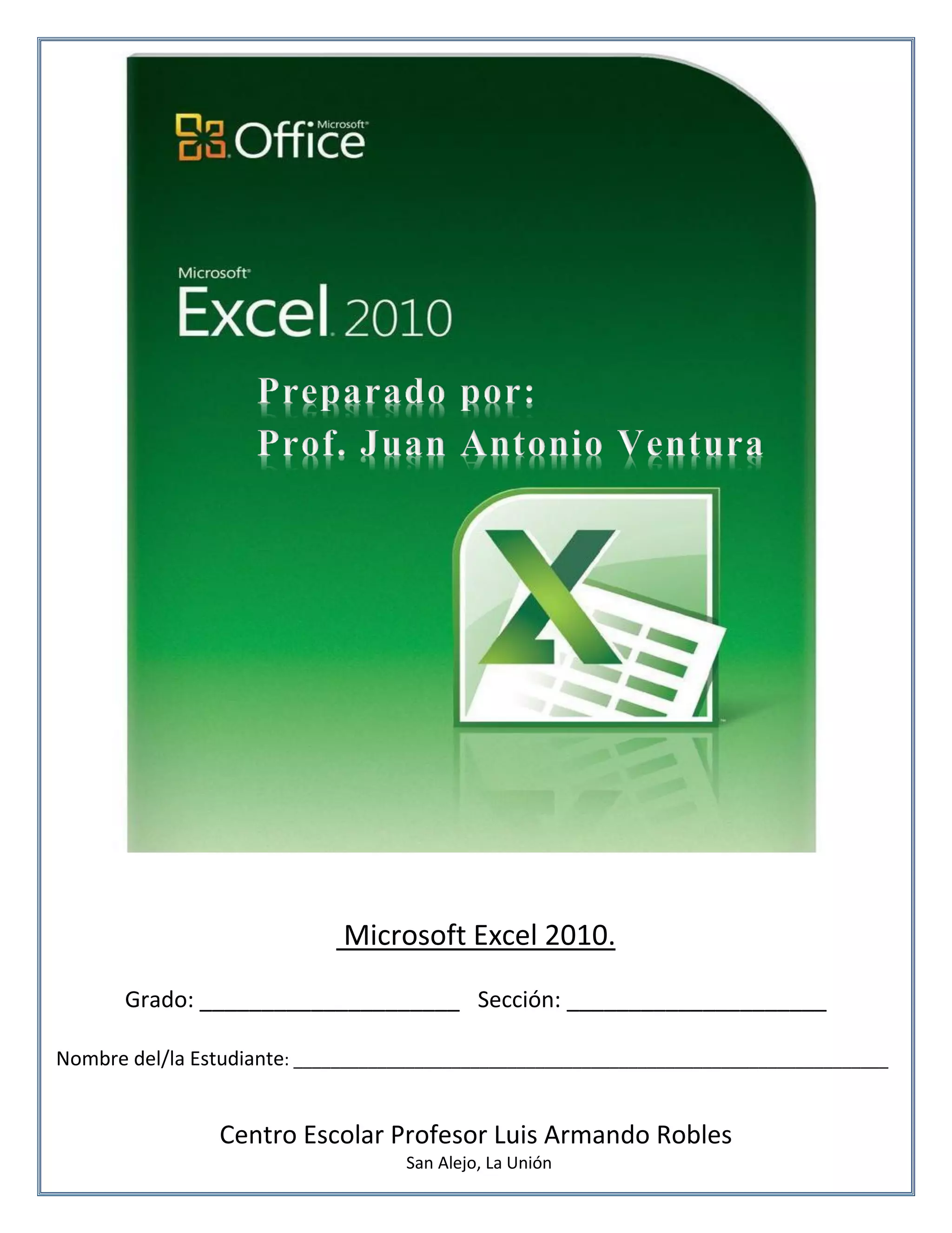 Este documento presenta una introducción a Microsoft Excel 2010. Explica los elementos básicos de la interfaz como barras, pestañas y botones. También describe cómo iniciar y cerrar Excel, crear y guardar archivos, seleccionar celdas y rangos, y usar funciones como SUM y autosuma. El objetivo es familiarizar a los estudiantes con la aplicación y prepararlos para crear y editar hojas de cálculo.