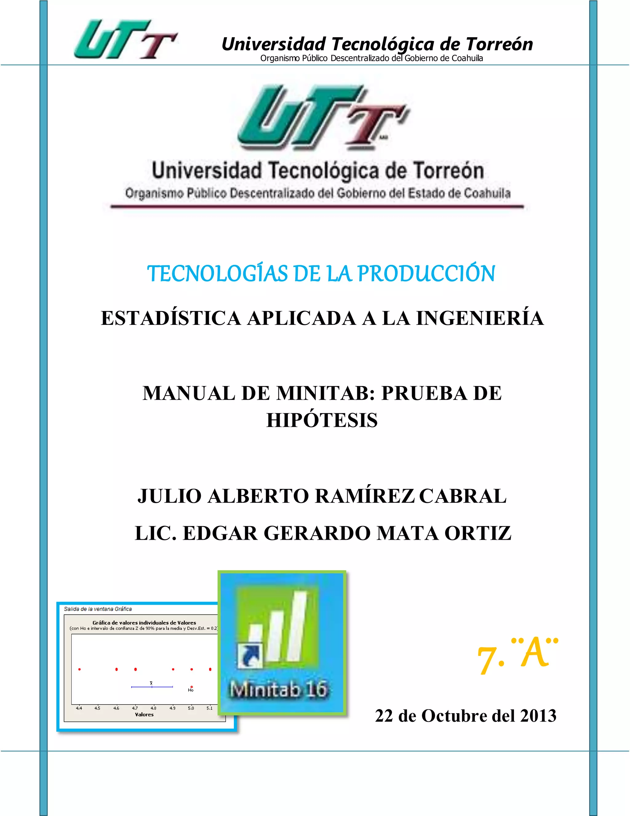 El documento proporciona instrucciones sobre cómo usar la herramienta de prueba de hipótesis Z de una muestra, t de una muestra, t de dos muestras independientes y t pareada en Minitab para analizar datos. Incluye ejemplos con datos de mediciones de artefactos y consumo de energía que ilustran cómo ingresar los datos y analizar los resultados para determinar si existe evidencia para rechazar las hipótesis nulas planteadas.