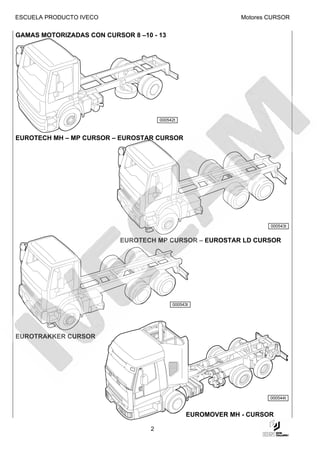 El documento resume las principales características de los motores Cursor 8, 10 y 13 de Iveco, incluyendo datos técnicos como cilindrada, potencia, par máximo, sistema de sobrealimentación, inyección, distribución, lubricación y refrigeración. También describe las gamas de motores, codificación, normativas anticontaminación y componentes principales.
