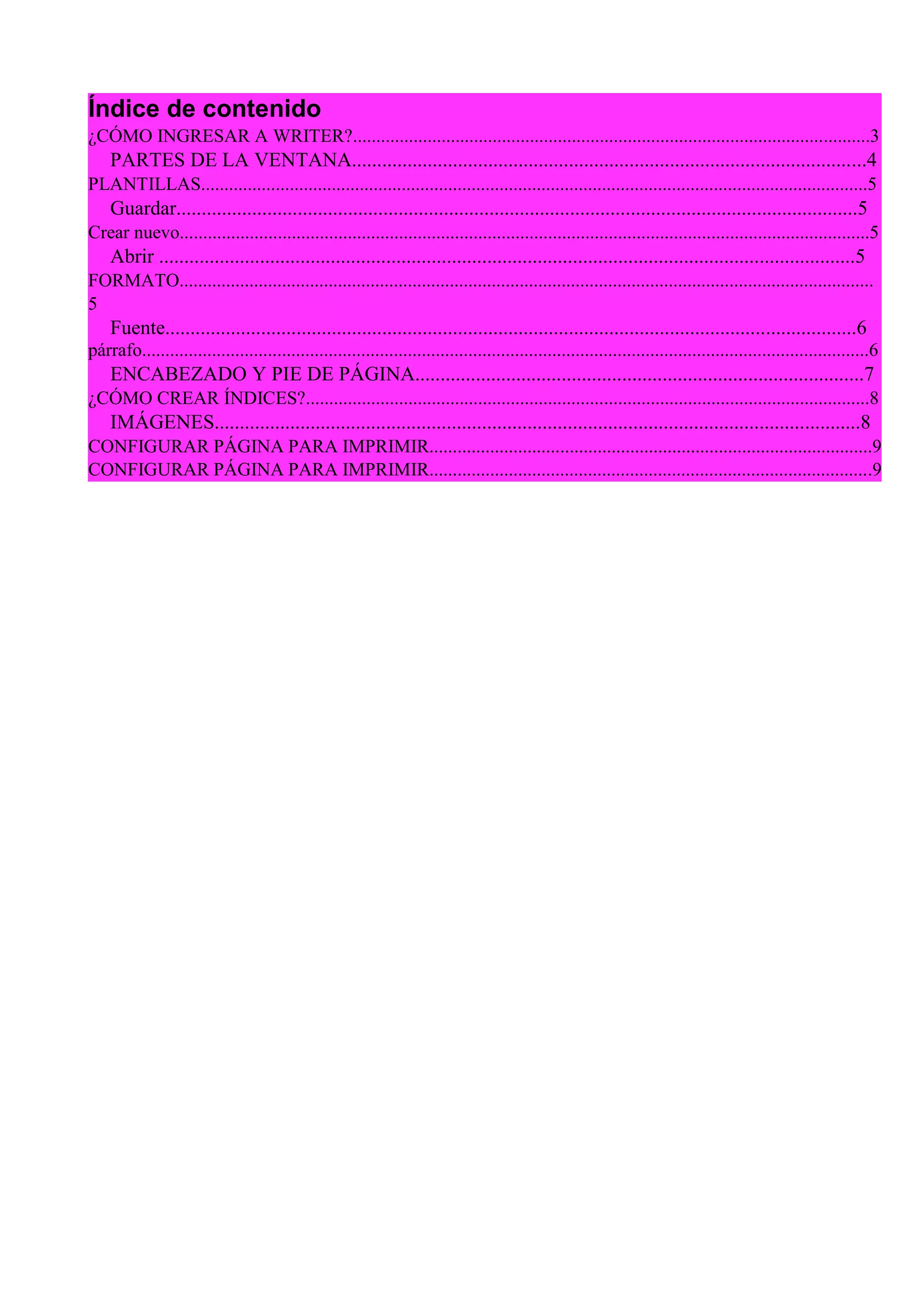 Este documento proporciona instrucciones sobre cómo usar LibreOffice Writer. Explica cómo ingresar a Writer, las partes de la ventana principal, cómo crear y usar plantillas, aplicar formato de fuente y párrafo, agregar encabezados y pies de página, crear índices, insertar imágenes, y configurar la página para imprimir. El documento ofrece procedimientos paso a paso para realizar estas tareas comunes en Writer.