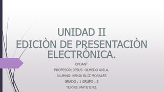 Este documento presenta información sobre la edición de presentaciones electrónicas usando PowerPoint. Explica conceptos clave como diapositivas, estilos, animación y vistas. Detalla las herramientas para editar diapositivas e insertar texto, imágenes, dibujos y otros objetos. Además, cubre cómo seleccionar, mover, copiar y borrar objetos dentro de las diapositivas.