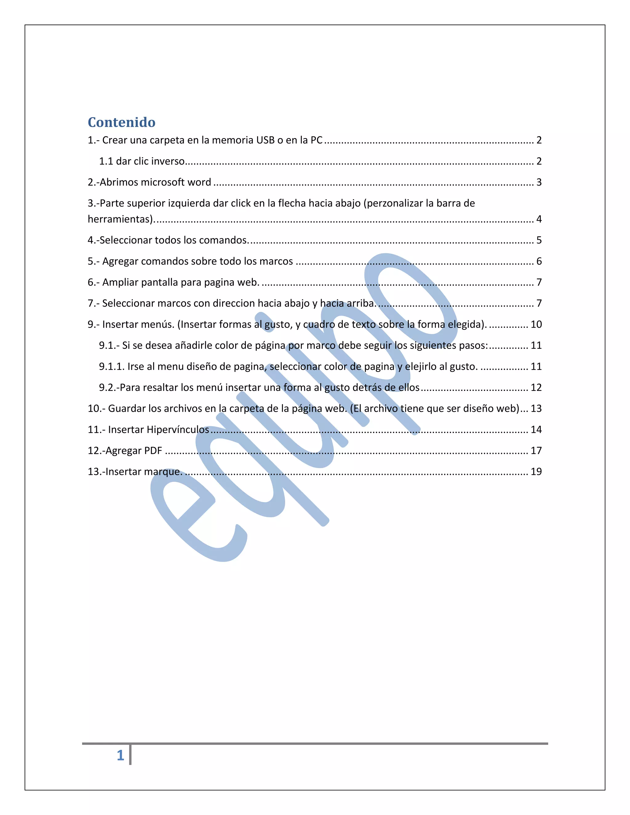 El documento proporciona instrucciones para crear una página web simple en Microsoft Word. Explica cómo dividir la página en marcos para diferentes secciones, agregar menús e hipervínculos, insertar archivos PDF, y agregar efectos de desplazamiento a los nombres de los autores.