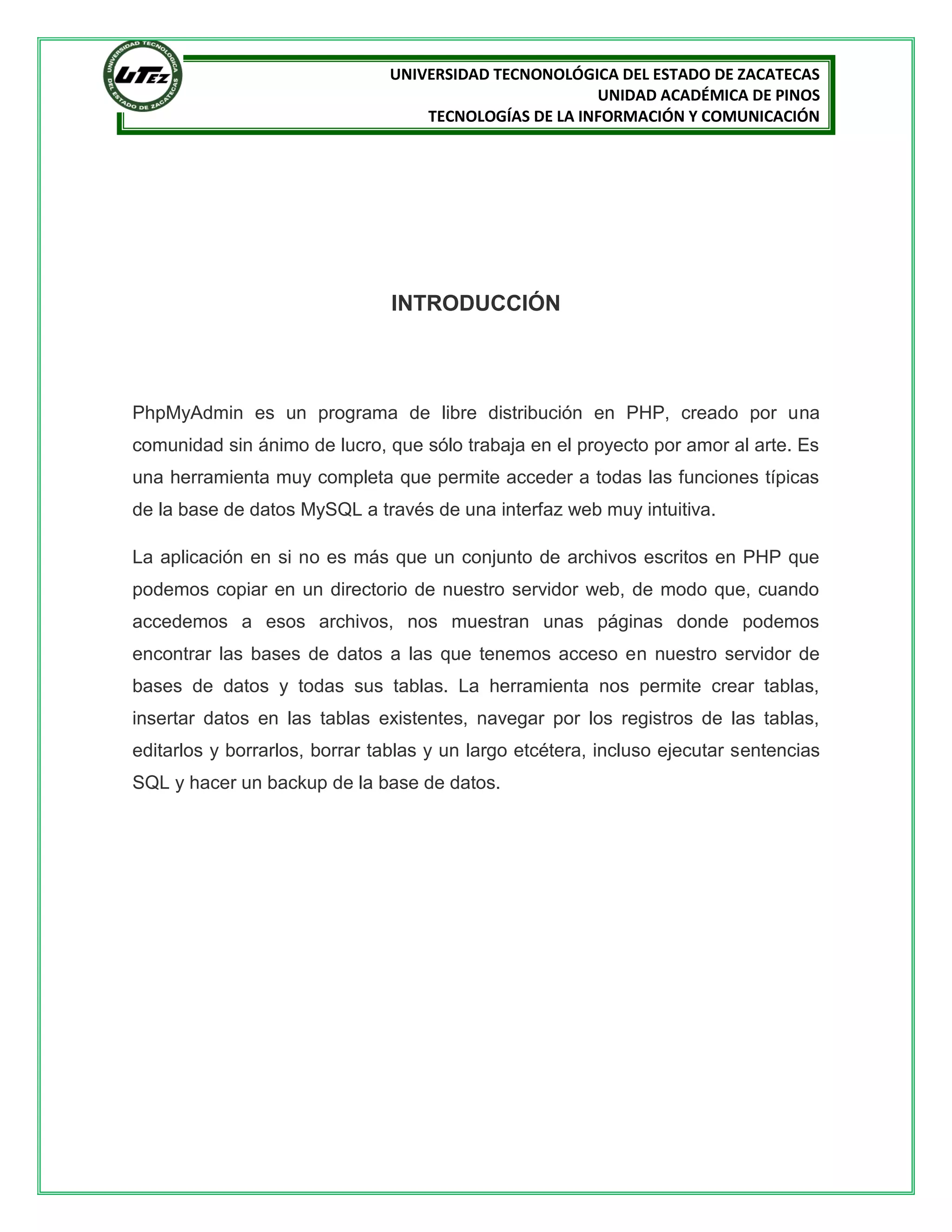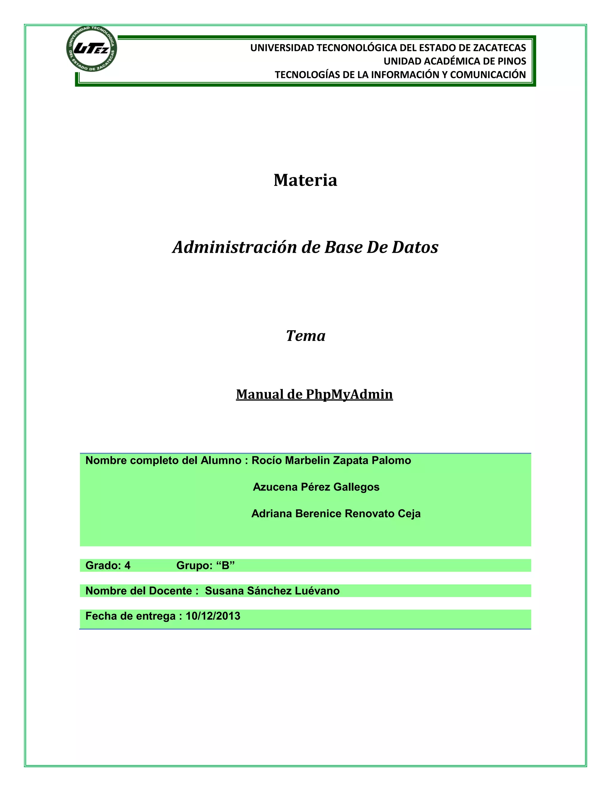 Este documento proporciona un manual de 12 pasos para usar la herramienta PhpMyAdmin. Explica cómo crear una base de datos y tablas, agregar datos, realizar consultas SQL, buscar, insertar, exportar e importar bases de datos. PhpMyAdmin permite administrar bases de datos MySQL de forma gráfica e intuitiva a través de una interfaz web.