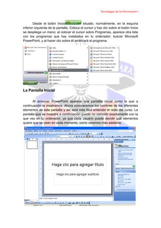 Este documento proporciona instrucciones sobre cómo usar PowerPoint. Explica cómo iniciar PowerPoint, la pantalla inicial y sus elementos como barras y áreas. También describe cómo guardar y abrir presentaciones, insertar y modificar diapositivas, agregar texto e imágenes, y aplicar animaciones y transiciones entre diapositivas.