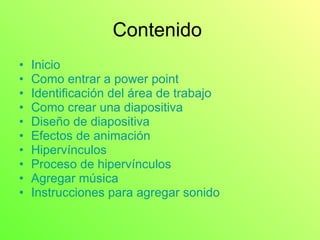 Este documento proporciona instrucciones sobre cómo usar PowerPoint. Explica cómo abrir PowerPoint, identificar las diferentes áreas de trabajo, crear y diseñar diapositivas, agregar efectos de animación e hipervínculos, y cómo insertar música y sonido a una presentación.