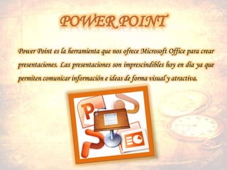 Power Point es la herramienta de Microsoft Office para crear presentaciones visuales y atractivas. Ofrece opciones para insertar elementos como texto, imágenes y formas prediseñadas. También permite aplicar animaciones y transiciones a los objetos para hacer las presentaciones más dinámicas.