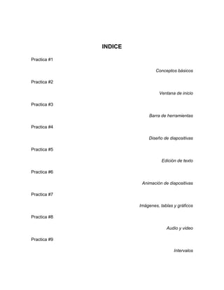Este documento presenta 10 prácticas sobre el ensamblaje y configuración de equipos de cómputo usando el programa PowerPoint. La práctica #2 explica los elementos de la ventana de PowerPoint como diapositivas, zona de trabajo, notas, ajustes visuales y más. La práctica #3 describe la barra de herramientas y sus pestañas. La práctica #7 cubre cómo insertar imágenes, tablas y gráficos en diapositivas y darles formato.
