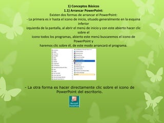 El documento explica los pasos básicos para crear una presentación en PowerPoint. Primero se abre PowerPoint y se crea una nueva presentación. Luego, se inserta texto e imágenes en las diapositivas utilizando las pestañas de inserción. Después, se añaden animaciones a los objetos en cada diapositiva y se configuran las transiciones entre diapositivas. Finalmente, la presentación se guarda en el escritorio para su visualización.