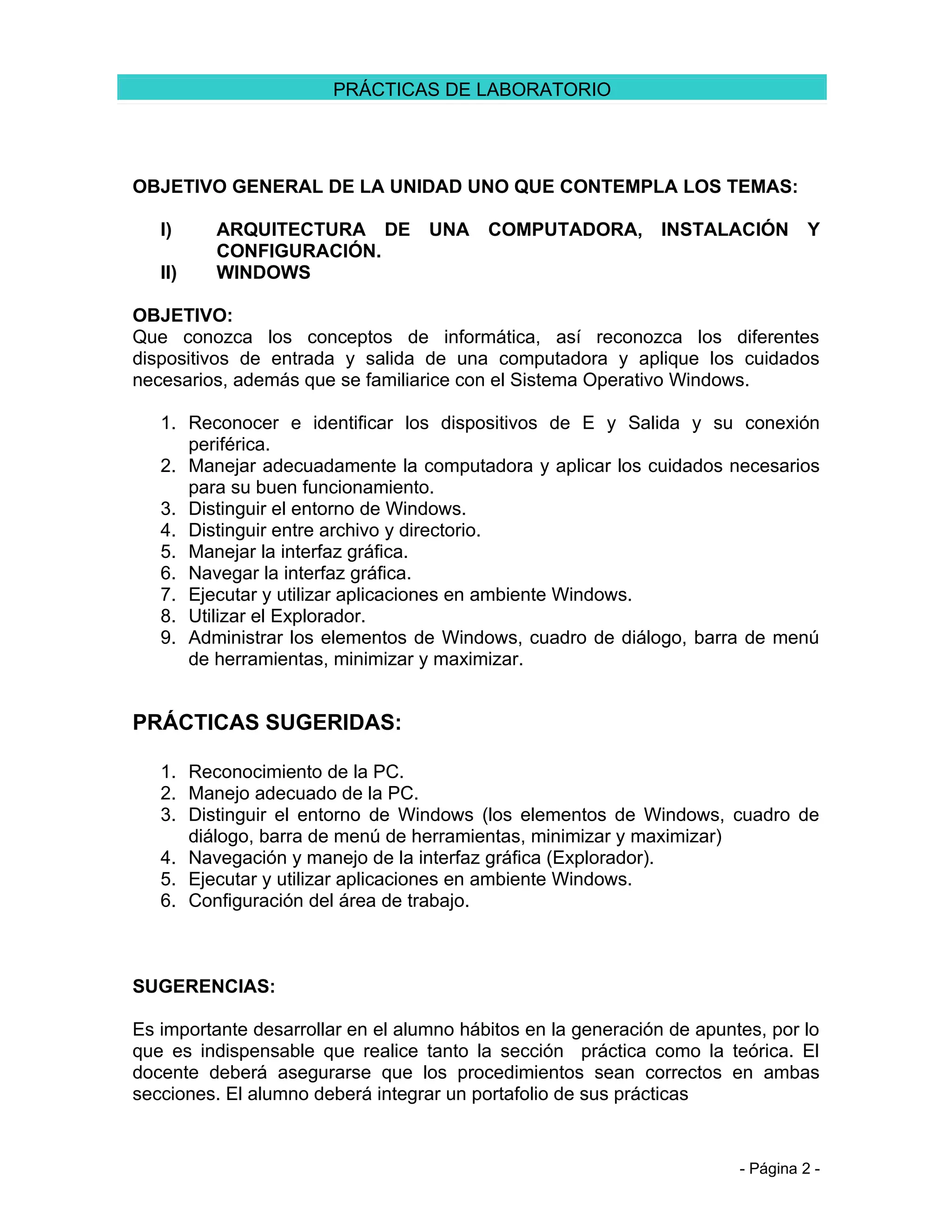 Este documento presenta el plan de prácticas de laboratorio para la asignatura de Informática I de la carrera de Tecnología Ambiental. Contiene objetivos generales y específicos de las unidades, así como sugerencias para las prácticas propuestas en temas como reconocimiento de hardware, manejo de Windows, uso del explorador y aplicaciones básicas. El docente deberá asegurarse que los estudiantes completen correctamente las secciones prácticas y teóricas para desarrollar hábitos de aprendizaje.