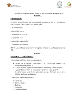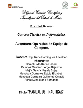 El documento es un manual de prácticas educativas del Colegio de Estudios Científicos y Tecnológicos del Estado de México, diseñado para el curso de Técnico en Informática. Incluye diversas actividades relacionadas con la operación de equipos de cómputo, como investigaciones sobre historia, seguridad e higiene, ensamblaje de computadoras y el uso de lenguajes de programación como Karel. Además, propone ejercicios prácticos para desarrollar habilidades en el uso de software y herramientas informáticas.