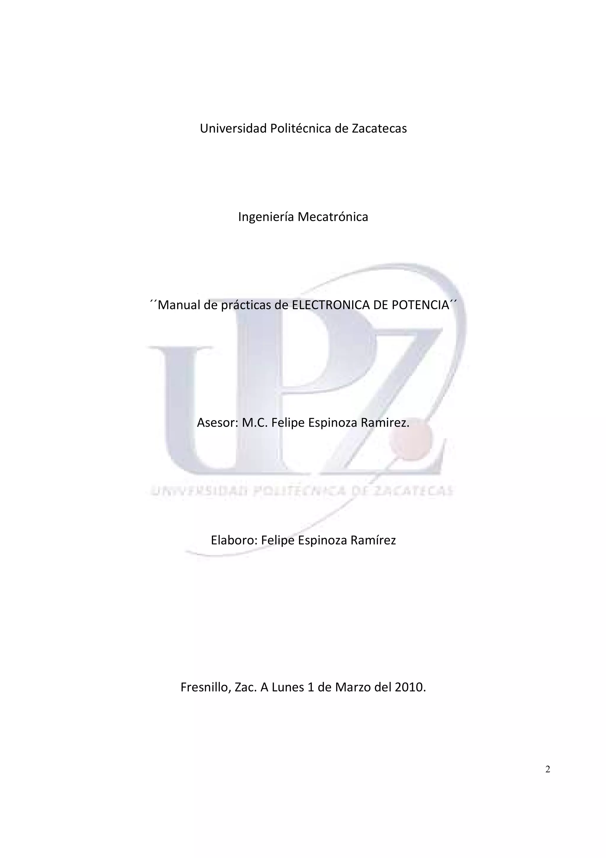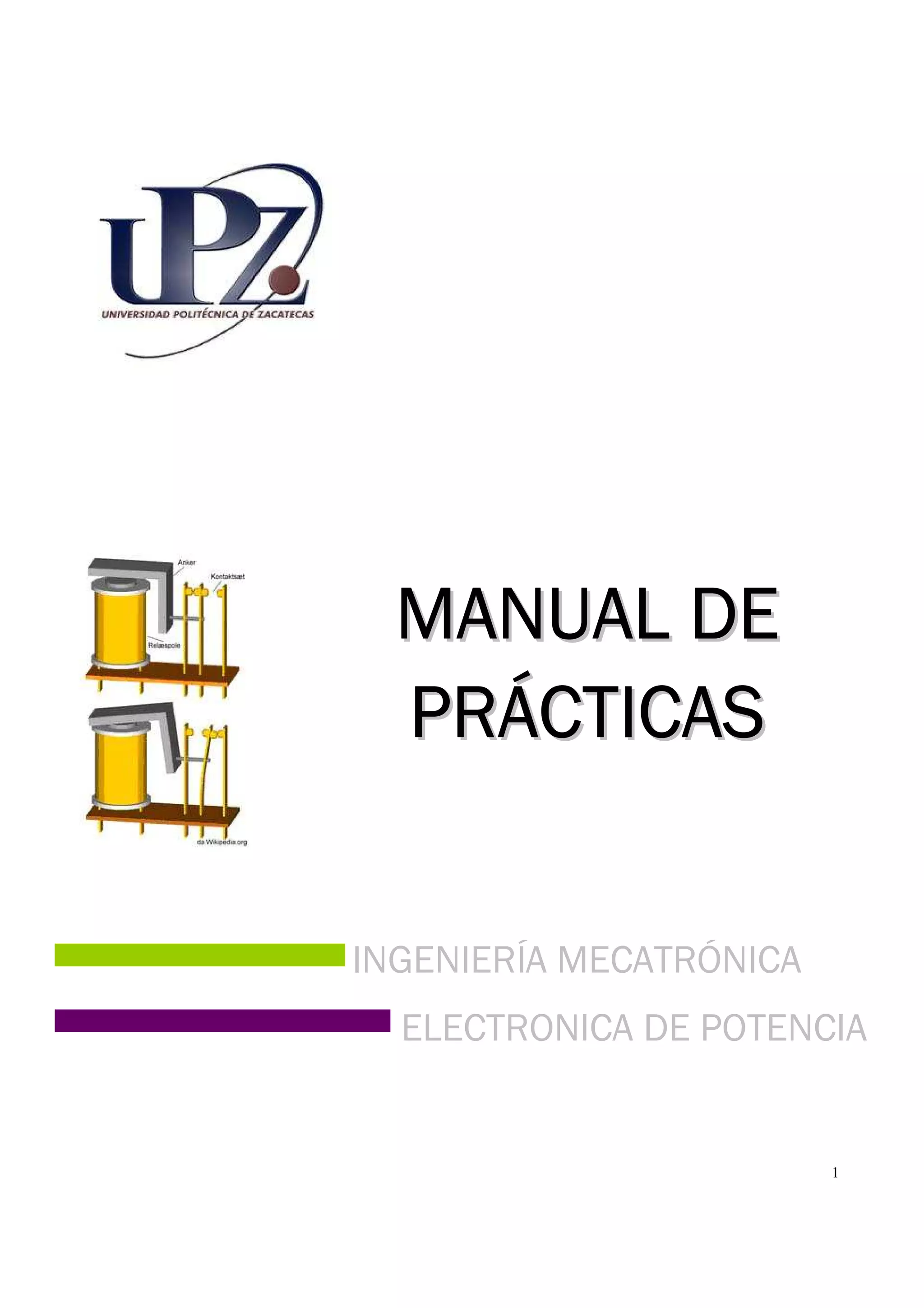 Este manual contiene 10 prácticas relacionadas con la electrónica de potencia. La práctica 5 involucra el análisis del TRIAC y sus aplicaciones. El alumno aprenderá sobre el funcionamiento y características del TRIAC para aplicaciones de control de potencia.