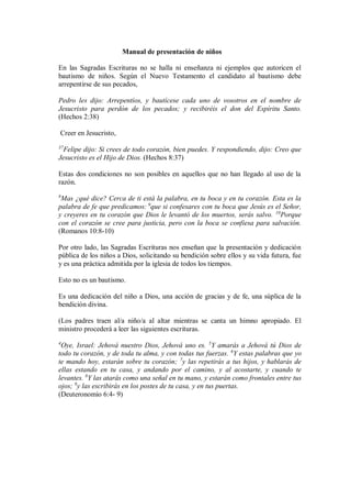 Este documento presenta un manual para la dedicación de niños al Señor en la Iglesia Cristiana Evangélica Wayuu. Incluye citas bíblicas que enseñan sobre la dedicación de niños a Dios, un ritual para que los padres dediquen a sus hijos al Señor prometiendo criarlos en Su camino, y una oración de dedicación.