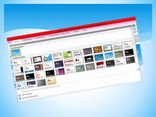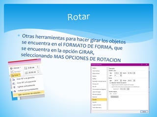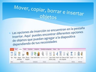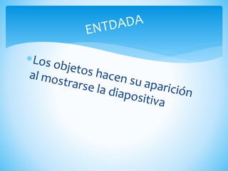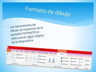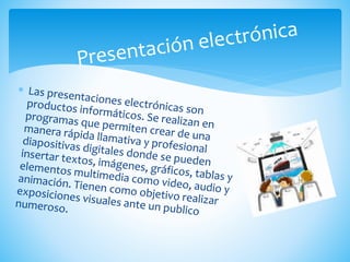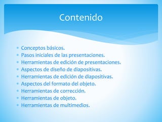 El documento describe las diferentes herramientas y funciones de una presentación de diapositivas, incluyendo cómo aplicar diseños, agregar animaciones, imágenes, audio y opciones de vista. Explica cómo agrupar y desagrupar objetos y aplicar formatos de texto.