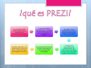 Prezi es una herramienta multimedia para crear presentaciones de forma dinámica y no lineal, que permite importar diferentes tipos de archivos como imágenes, PDF y videos. Puede usarse en línea o descargando el archivo para presentaciones sin conexión a internet. Ofrece cuentas gratuitas con 100MB de almacenamiento o de pago con más funcionalidades.