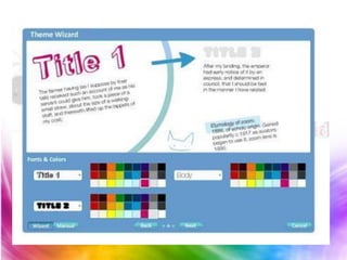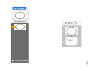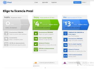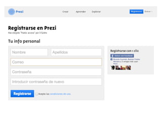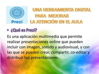 Prezi es una aplicación que permite crear presentaciones multimedia online que pueden incluir imágenes, sonido y video. Los usuarios pueden crear una cuenta en Prezi.com de forma gratuita u paga e inmediatamente comenzar a crear una nueva presentación insertando marcos, texto, imágenes y videos. Las presentaciones se crean organizando los marcos en un orden específico llamado "Editar Ruta" para controlar la secuencia.