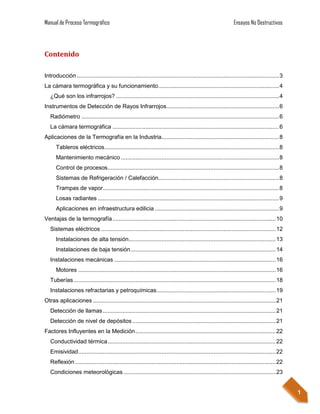 Este documento presenta un manual de procedimientos para inspecciones termográficas. Explica brevemente cómo funcionan las cámaras termográficas capturando la radiación infrarroja invisible para el ojo humano. Luego detalla aplicaciones comunes de la termografía en sistemas eléctricos, mecánicos, tuberías, estructuras y más. Finalmente, cubre factores que afectan las mediciones térmicas y los pasos para realizar inspecciones termográficas.