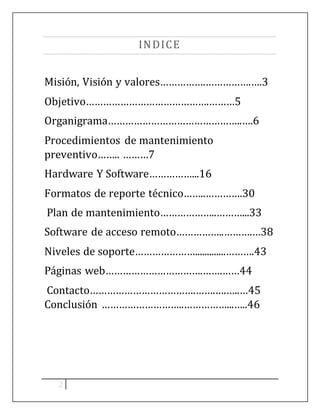Este documento presenta información sobre los procedimientos y políticas de soporte técnico de una empresa llamada TecnoSoluciones. Incluye secciones sobre mantenimiento preventivo y correctivo, hardware y software, formatos de reportes, planes de mantenimiento, software de acceso remoto, niveles de soporte y contacto. El objetivo es facilitar el desempeño de los técnicos al proporcionar servicios de soporte de una manera eficiente.