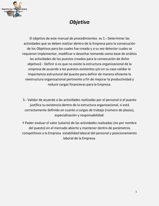 Este manual de procedimientos de soporte técnico describe los pasos a seguir para realizar mantenimientos preventivos y correctivos de hardware y software, así como para diagnosticar y resolver problemas comunes. Incluye información sobre desfragmentación de discos, eliminación de archivos temporales, actualización de antivirus y software, y copias de seguridad. El objetivo es estandarizar los procesos de soporte para brindar un servicio eficiente a los clientes