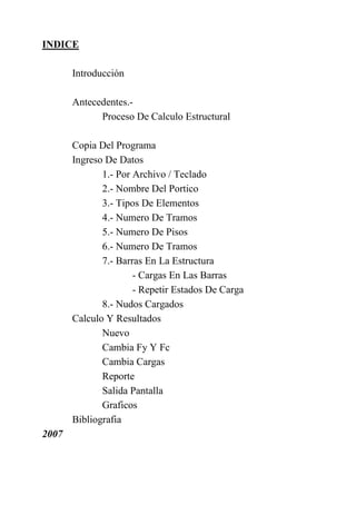 Este documento resume el funcionamiento de un programa de diseño estructural para pórticos ortogonales llamado DEPO. El programa permite al usuario ingresar datos geométricos y de carga de una estructura, realiza los cálculos estructurales necesarios y proporciona resultados como momentos, cortantes, giros y desplazamientos. El documento explica el proceso de cálculo, la interfaz del usuario, y las opciones para ver y modificar los resultados del análisis estructural.