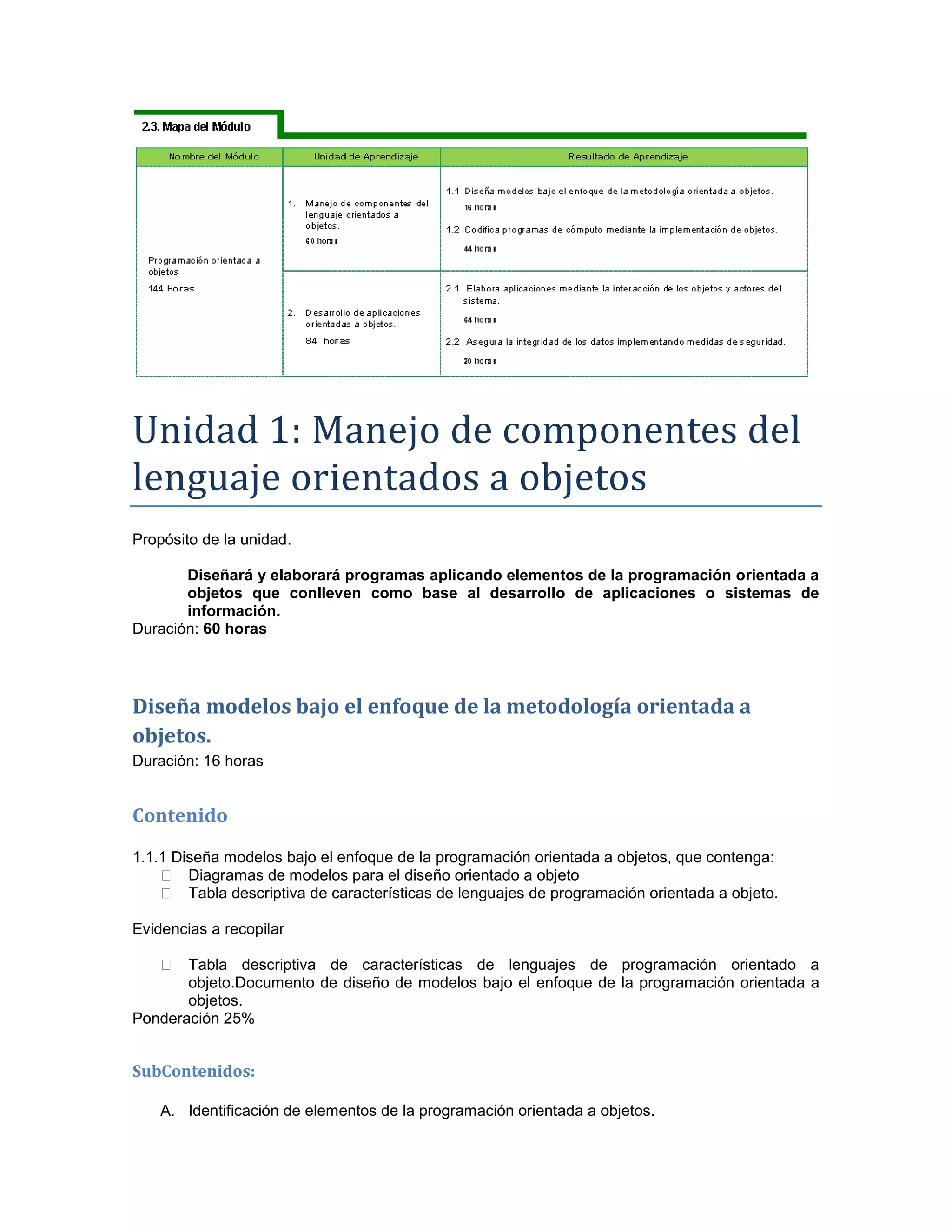 Este documento describe la Unidad 1 de un curso sobre manejo de componentes del lenguaje orientado a objetos. La unidad se enfoca en diseñar modelos bajo el enfoque de programación orientada a objetos durante 16 horas. Los estudiantes aprenderán sobre diagramas de modelos, características de lenguajes de programación orientados a objetos, y elementos clave como objetos, clases, herencia y polimorfismo.