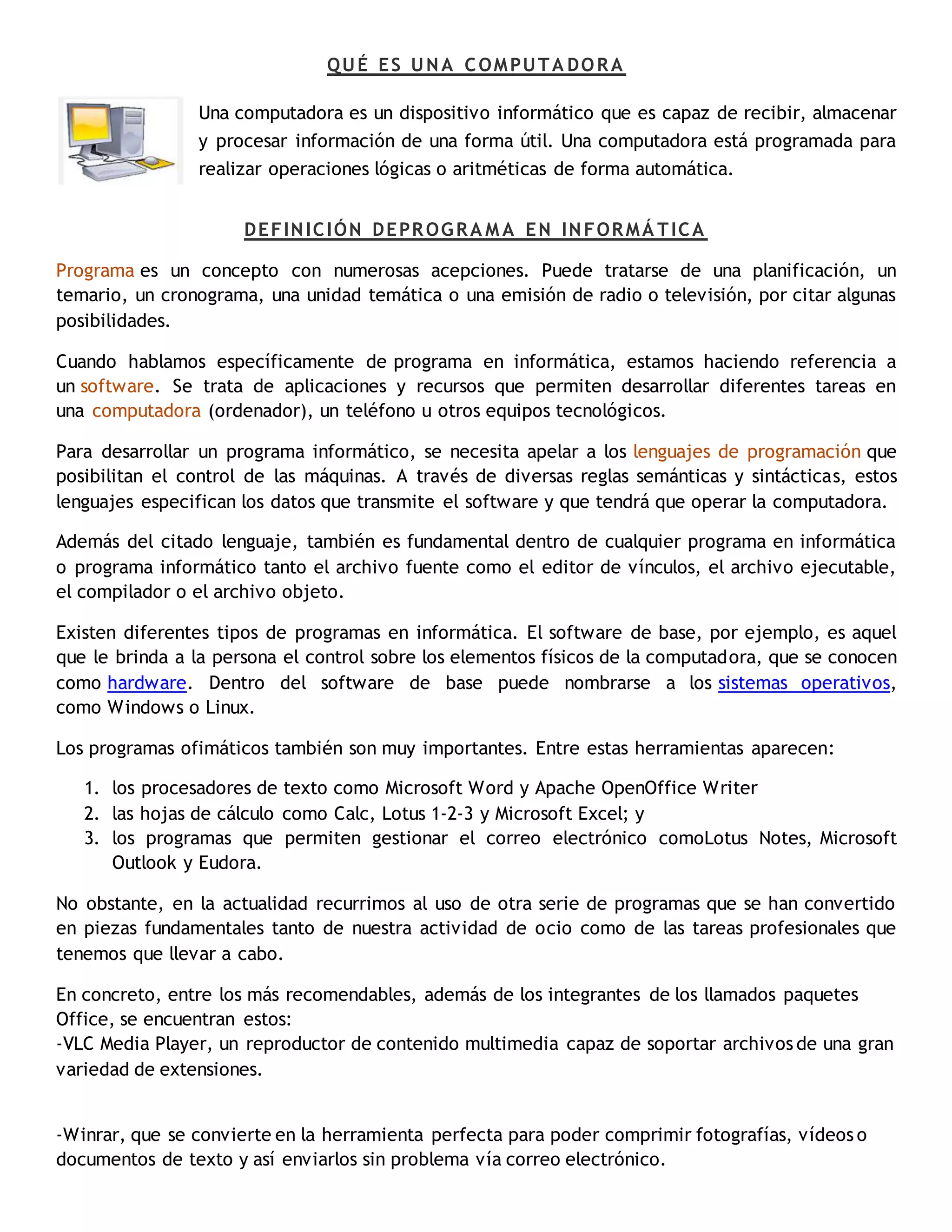 Este documento introduce conceptos básicos sobre computadoras, programación e informática. Explica que una computadora puede recibir, almacenar y procesar información de forma automática, y que un programa es un software que permite realizar tareas en una computadora. También describe diferentes tipos de programas como sistemas operativos, programas de oficina y antivirus, e introduce conceptos como algoritmo, lenguajes de programación y características de los algoritmos.