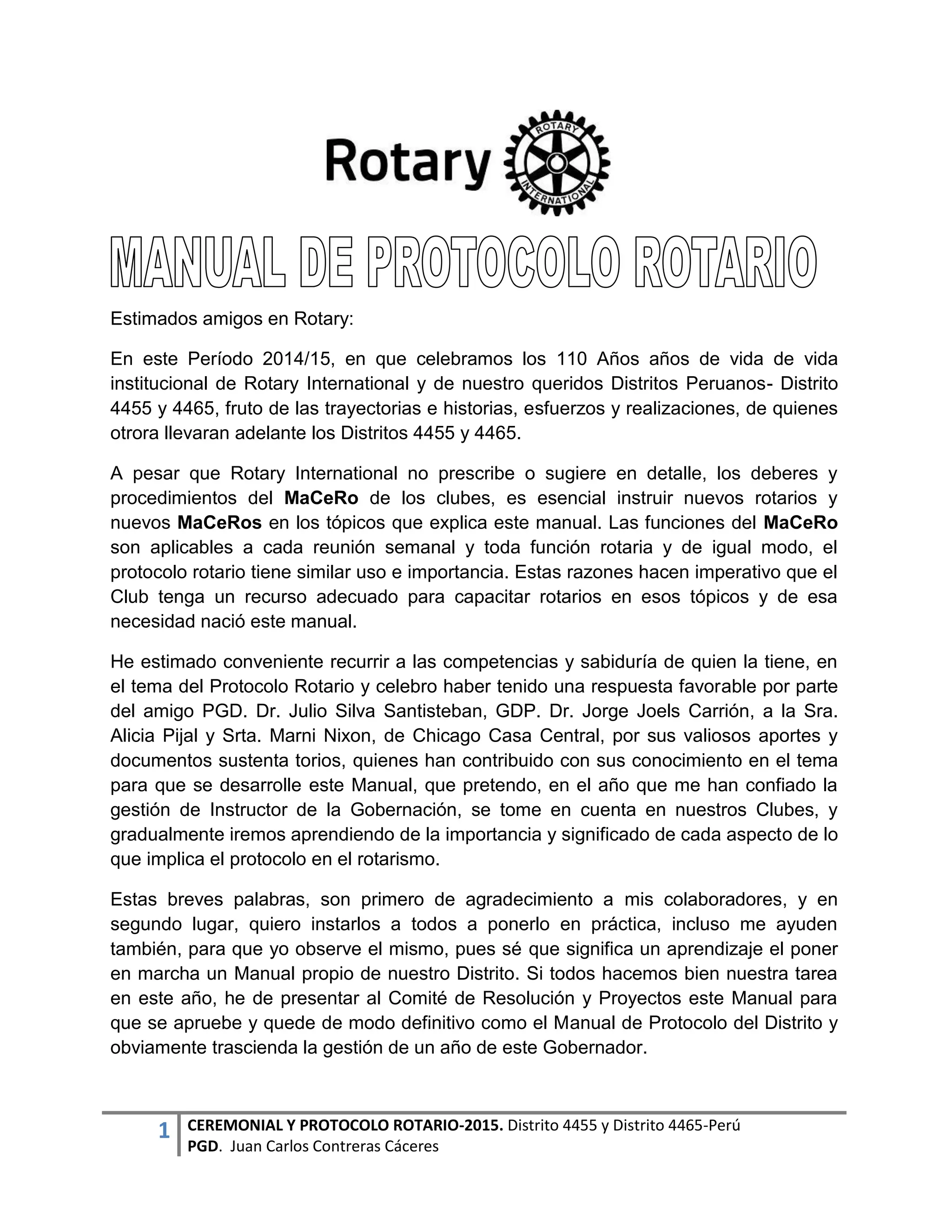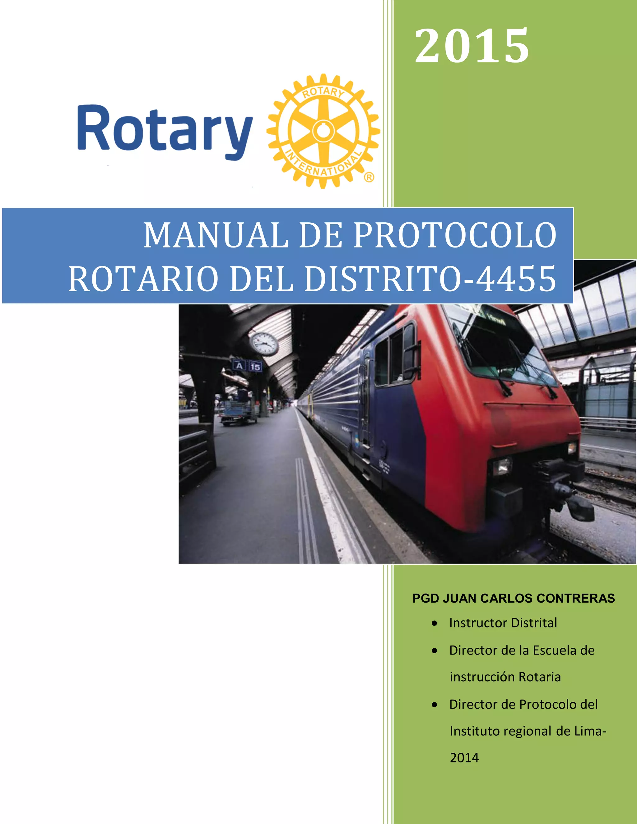 El documento es un manual de protocolo y ceremonial rotario del distrito 4455 y 4465 de Perú, elaborado por Juan Carlos Contreras para instruir a los rotarios en la aplicación de las normas protocolarias en reuniones y eventos. Se destaca la importancia del protocolo en la organización de actos, el orden de prelación de las autoridades y el respeto que debe prevalecer en cada reunión. Además, se anima a los clubes a utilizar este manual y a proporcionar retroalimentación para su mejora y aprobación final.