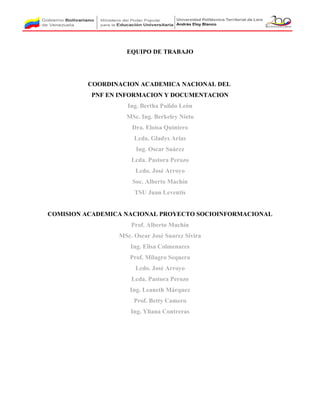 Este documento presenta las directrices para el desarrollo de proyectos comunitarios como parte del Programa Nacional de Formación en Información y Documentación de Venezuela. Detalla la estructura organizativa requerida, el protocolo de campo, los contenidos por periodo, el marco jurídico y las diferentes etapas del proceso de investigación para el proyecto. El objetivo es guiar a los estudiantes en el abordaje metodológico para el desarrollo efectivo de un proyecto socio-informacional