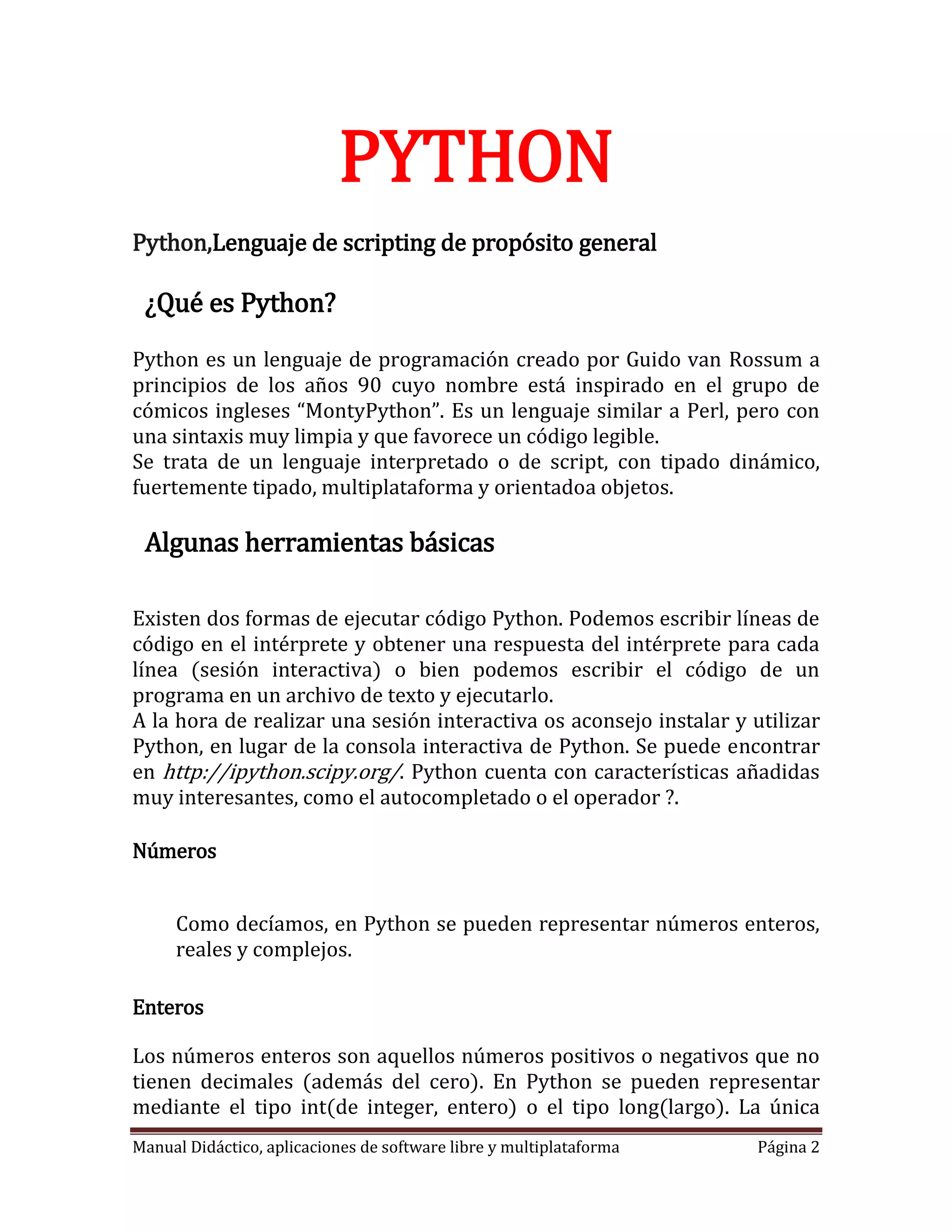Este documento presenta Python como un lenguaje de programación de propósito general, interpretado y orientado a objetos. Explica que Python fue creado por Guido van Rossum y que es un lenguaje simple y legible similar a Perl. También describe algunas herramientas básicas de Python como el intérprete interactivo y cómo ejecutar programas Python guardados en archivos.