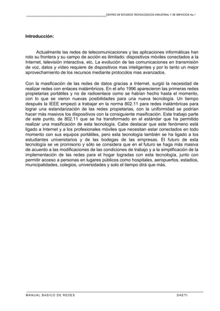 Este manual describe los conceptos básicos de las redes, incluyendo los componentes de un sistema de comunicación, tipos de comunicación, modos de transmisión de datos, definición de redes, elementos de una red, clases de redes como LAN, MAN y WAN, y el papel de los gateways. El objetivo es proporcionar una introducción general a los fundamentos técnicos de las redes de computadoras.