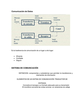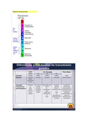El documento describe los diferentes tipos de redes (LAN, MAN, WAN), sus características y diferencias. También explica conceptos clave como la comunicación de datos, los protocolos, los elementos de un sistema de comunicación, los medios de transmisión guiados e inalámbricos, y las técnicas para la codificación y transmisión digital de datos.
