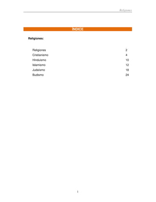 El documento presenta una introducción general sobre las religiones, describiendo sus elementos comunes como creencias, prácticas, y la relación entre Dios y el hombre. Luego se enfoca en explicar brevemente cinco de las principales religiones mundiales - el cristianismo, hinduismo, islam, judaísmo y budismo - resaltando sus orígenes, creencias básicas, y su impacto histórico. Finalmente, ofrece más detalles sobre el cristianismo, incluyendo sus divisiones principales y su evolución a lo largo de la histor