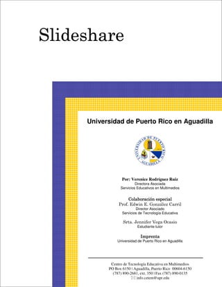 Este documento explica cómo usar Slideshare, un servicio web gratuito para compartir presentaciones de PowerPoint. Explica cómo crear una cuenta, subir una presentación, y visualizar presentaciones subidas por otros usuarios. Detalla los pasos para iniciar sesión, subir una presentación, editar la información asociada y acceder a las presentaciones subidas. El objetivo es proporcionar instrucciones claras sobre cómo usar las funciones básicas de Slideshare.